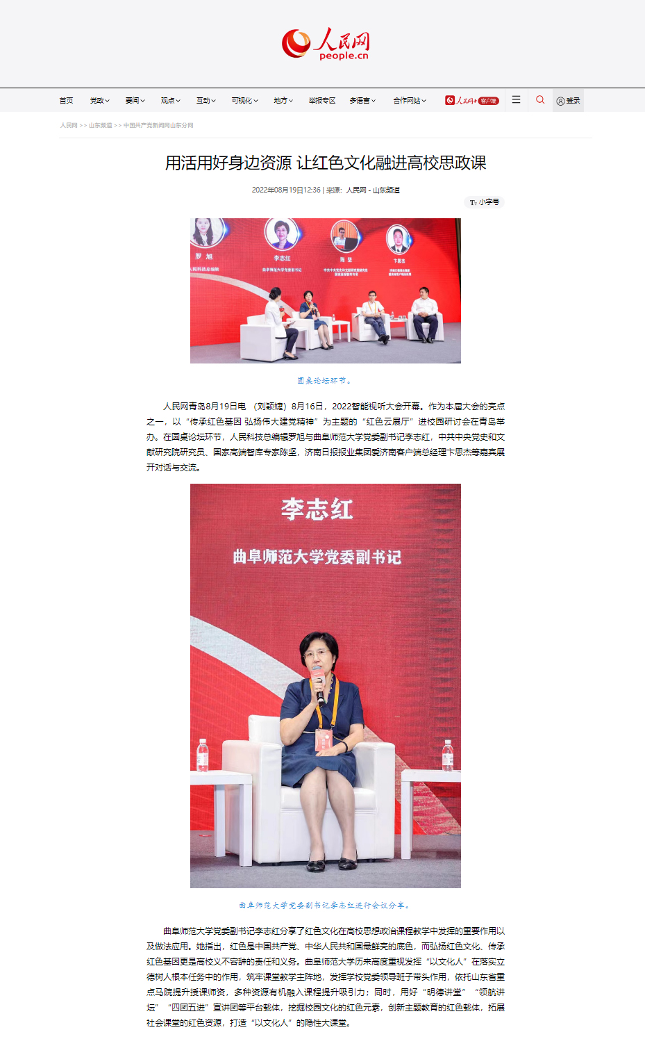 8月16日,由中央网信办、人民日报社、山东省人民政府指导,青岛市人民政府、山东省委网信办、人民网主办的2022智能视听大会开幕。作为本届大会的亮点之一,以“传承红色基因 弘扬伟大建党精神”为主题的“红色云展厅”进校园研讨会在青岛举办,人民网以《筑牢红色教育阵地 为现代化强省建设贡献曲师力量》《用活用好身边资源 让红色文化融进高校思政课》为题报道了完美体育(中国)官方网站厚植传统底蕴、传承红色基因、推进立德树人的红色教育开展情况。