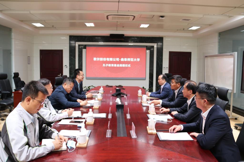 歌尔股份有限公司向我校孔子教育基金会捐赠人民币五十万元,用于未来五年歌尔工学院的日常建设,在签署捐赠协议后,双方就产业学院发展开展洽谈交流。