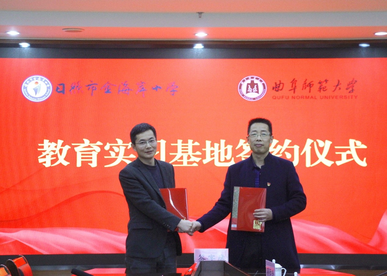 仪式上,卢国强与于西庆共同为教育实习基地揭牌,我校教务处副处长熊吉忠与日照市金海岸小学教育集团副校长宋凯华代表双方签署合作协议。