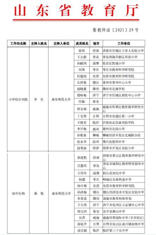 曲阜师大新闻中心讯 近日,山东省教育厅公布了山东省特级教师工作坊成员名单。在前期主持人遴选过程中,经过全省各高校、各市教育局及有关单位遴选推荐、专家评审,共43人入选。我校教育学院李允教授、生命科学学院燕艳副教授入选山东省特级教师工作坊主持人。近期两位主持人将根据山东省特级教师工作坊工作方案,组织工作坊成员开展全省优秀青年小学实践教师、初中生物学教师的培训工作。