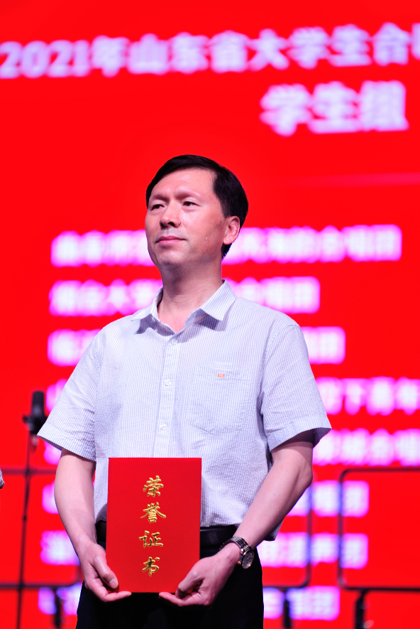 曲阜师大新闻中心讯6月19日晚,“颂歌献给党”2021年山东省大学生合唱艺术节暨中小学教师合唱展示活动汇报演出在青岛举行,省教育厅副厅长孙晓筠出席并作讲话。我校“儒风海韵”合唱团应邀参加展演,激情演绎官宇博士的原创佳作《谷雨梯田》,合唱队的完美表现赢得在场观众的阵阵掌声。在展演颁奖环节,音乐学院院长肖桂彬代表团队上台领奖。