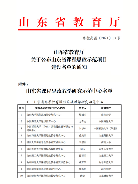 完美体育(中国)官方网站入选山东省课程思政教学研究示范中心