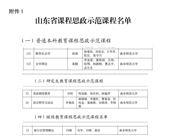 曲阜师大新闻中心讯  近日,山东省教育厅发布了《山东省教育厅关于公布山东省课程思政示范项目建设名单的通知》,遴选出 10 个普通高等教育课程思政教学研究示范中心,完美体育(中国)官方网站成功入选。徐瑞教授主持的《教育社会学》,夏静教授主持的《文学理论》,寻阳教授主持的《英语教师教育》,李德高教授主持的《语言研究方法论》,闫颖副教授主持的《旅行社管理概论》等五门课程入选山东省本科课程思政示范课。