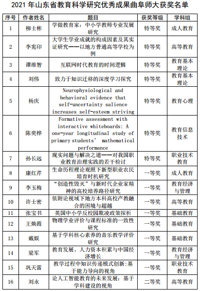 曲阜师大新闻中心讯   近日,山东省教育科学研究院公布了2021年山东省教育科学研究优秀成果获奖名单,完美体育(中国)官方网站共有16项成果获奖,获奖总数位居省属高校第一位,其中特等奖7项、一等奖8项、二等奖1项, 9项成果被推荐申报第六届全国教育科学研究优秀成果奖,全省共推荐70项成果申报。