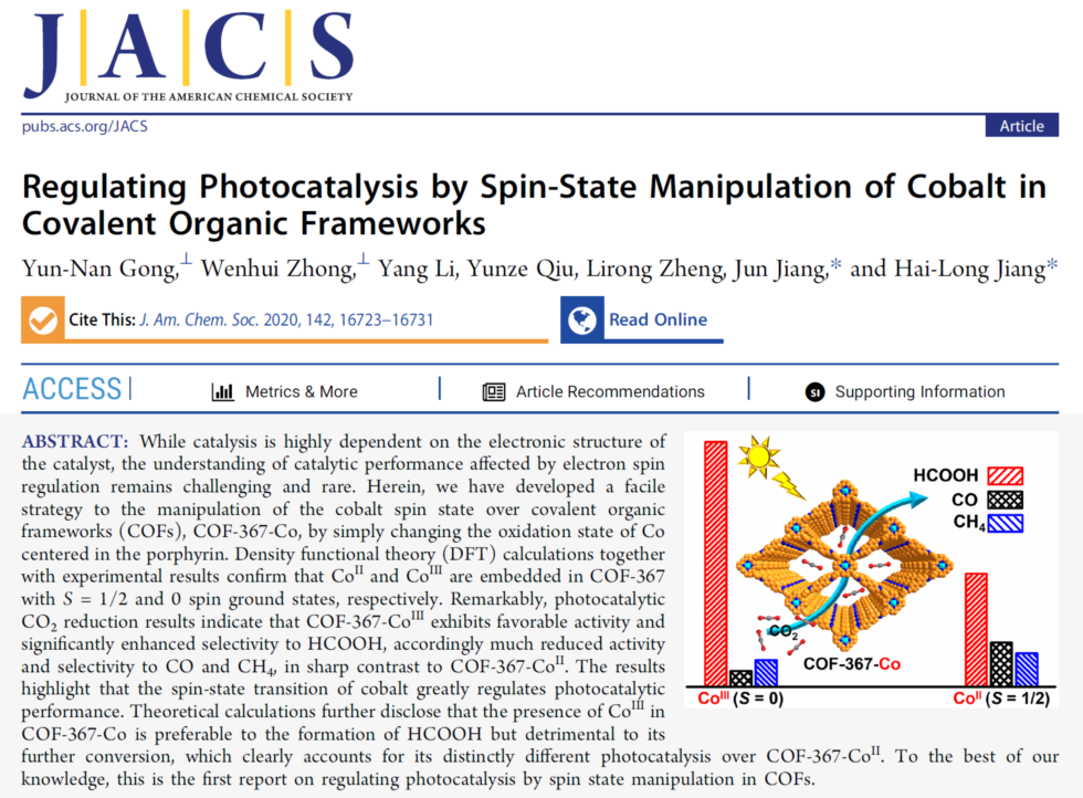 此外,2020年9月,钟文辉副教授与中国科学技术大学江俊教授合作的另一篇题为“Regulating Photocatalysis by Spin-State Manipulation of Cobalt in Covalent Organic Frameworks” (doi:10.1021/jacs.0c07206),也发表在《美国化学会志》(Journal of the American Chemical Society)上,完美体育(中国)官方网站为共同署名单位,钟文辉副教授为该论文的共同第一作者。
