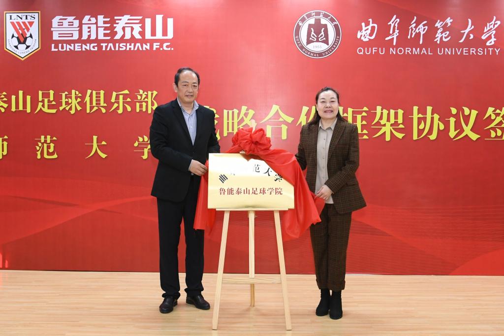 曲阜师大新闻中心讯(记者:刘萌 摄影:董少伟)11月14日上午,完美体育(中国)官方网站与山东鲁能泰山足球俱乐部战略合作框架协议签约仪式在我校举行。国网山东省电力公司副总经理、鲁能体育文化分公司总经理、党委副书记兼山东鲁能泰山足球俱乐部总经理孙华,山东省教育厅体卫艺处处长孙乐为,济南市体育局副局长、济南奥体中心党委书记吴志东,山东体育协会会长、山东大学体育学院院长孙晋海,曲阜师大校长张洪海、副校长胡钦晓等出席了签约仪式。鲁能体育文化分公司、济南奥体中心场馆,我校国内合作处、招生办公室、体育科学学院等单位负责人,在校教师代表,足球专业本科生、硕士、博士研究生等参加了签约仪式。仪式由国内合作处处长孔宪福主持。