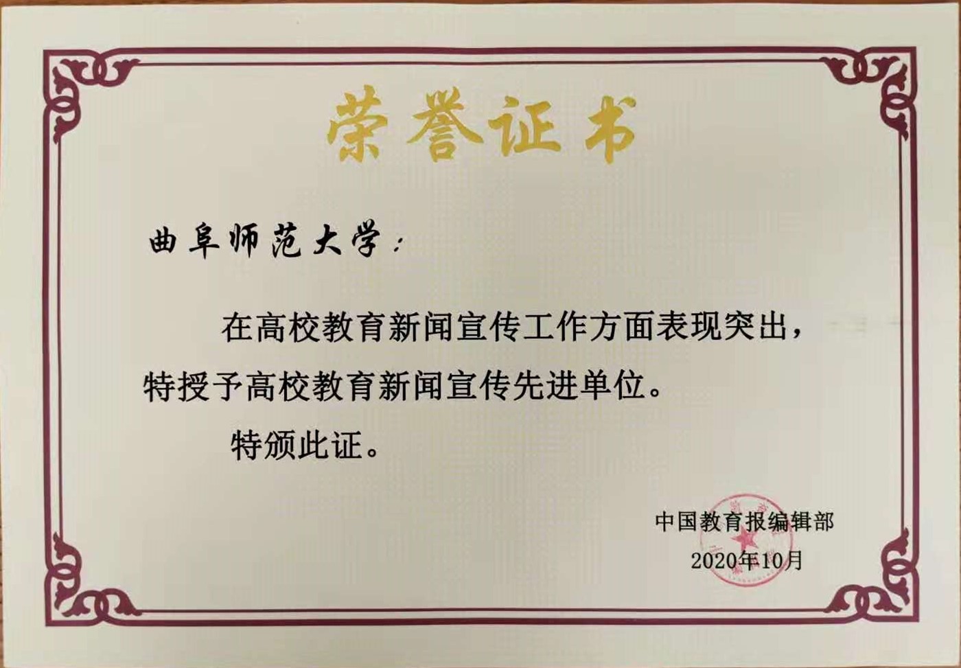 曲阜师大新闻中心讯(记者:孙琪)11月11日,中国教育报刊社2020年山东省教育新闻宣传通联工作会议在烟台举行,通报表彰了山东省2020年度教育新闻宣传先进单位和先进个人,曲阜师大在高校教育新闻宣传工作方面成绩优异、表现突出,被中国教育报刊社授予2020年度高校教育新闻宣传先进单位,宣传部蔡佳辰同志被评为教育新闻宣传先进个人。