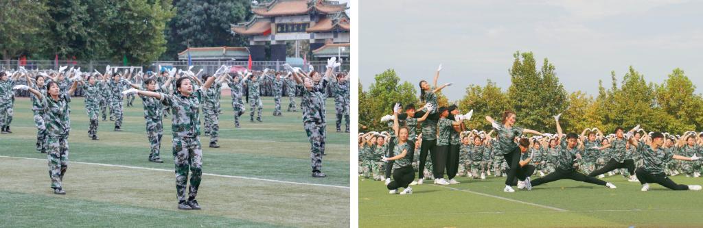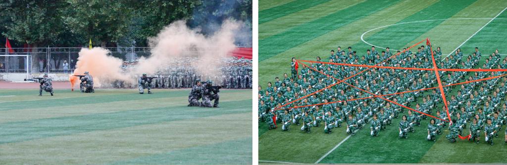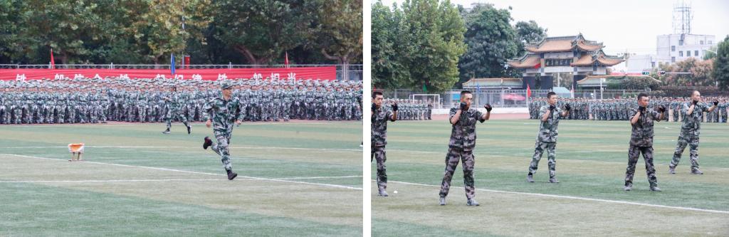 大会在高亢嘹亮的国歌声中拉开序幕。在随后的军训汇报表演中,青年学子们为了表达对祖国母亲最深沉的热爱、对建校65周年最热情的祝福,摆出了“中国”“白衣为甲 逆行出征”“强国一代 青春脊梁”“学而不厌 诲人不倦”“1955—2020”“我爱曲园”等数字和词语,摆出了祖国地图、“犁牛之子”等图形;队列方队展示了分队队列动作的训练成果;擒敌拳与应急棍术方队呈现了一场中国功夫的视觉盛宴;剑术方队、内务方队和心理健康操方队动作整齐划一,充满着奋发向上的精神风貌;定向越野方队展示了士兵的坚韧不拔、持之以恒的坚强意志;战地救护和格斗方队尽显英雄气概,赢得阵阵掌声。