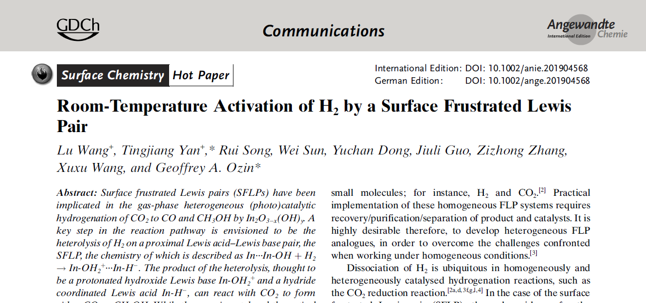 第一篇论文为“Polymorph selection towards photocatalytic gaseous CO2 hydrogenation”(DOI:10.1038/s41467-019-10524-2)发表在《自然》子刊《Nature Communications》上,颜廷江教授为该论文的第一作者与通讯作者,完美体育(中国)官方网站为第一署名单位;第二篇论文为“Room-Temperature Activation of H2 by a Surface Frustrated Lewis Pair”(DOI:10.1002/anie.201904568)发表在化学领域顶级期刊《Angewandte Chemie International Edition》,并被编辑选为“Hot Paper”,颜廷江教授为共同第一作者与通讯作者,完美体育(中国)官方网站为共同署名单位。