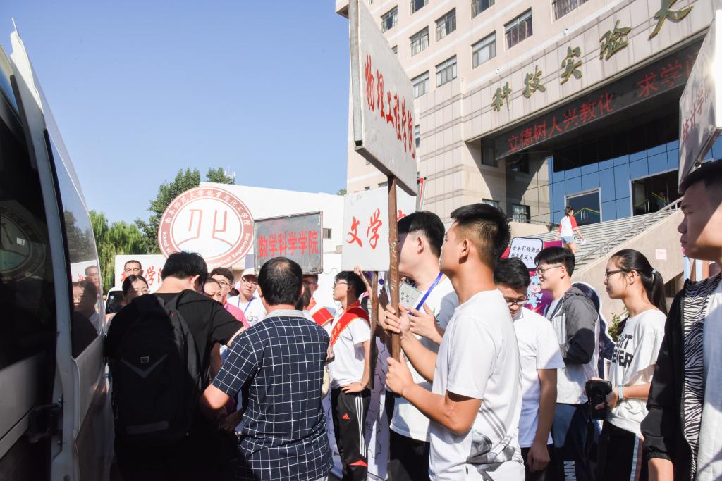 在9月8日至9日两天的报到期间,学校在汽车站、火车站和高铁站设置了多个迎新接站服务点,学生工作处组织了90多名志愿者,从清晨6点半到晚上9点一直坚守接站岗位,迎接远道而来的新生和家长。
