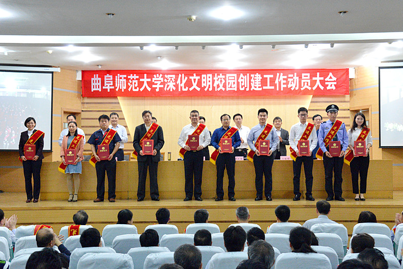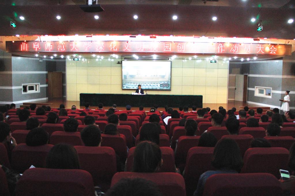 焕发曲园文明新气象、开启成风化人新征程。5月22日下午,我校召开深化文明校园创建工作动员大会。学校领导戚万学、张洪海、扈庆学、王继锁、郭辰夫、冯冲、辛杰、明清河出席会议,全校科级以上干部、各单位文明校园创建工作领导小组成员、全体辅导员和部分学生代表参加了会议。会议由校长张洪海主持。