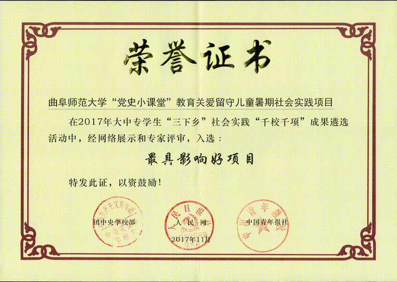 “党史小课堂”教育关爱留守儿童暑期社会实践项目由我校历史文化学院于2017年组织发起,已经在济宁梁山、临沂沂南两地建立起社会实践基地,活动以关爱留守儿童为主线,在帮助留守儿童辅导功课的同时进行党史、国史教育。人民网、人民日报客户端、光明网、齐鲁晚报等二十多家媒体对活动进行了报道。活动还获评2017年山东省大中专学生暑期“三下乡”社会实践优秀团队。
