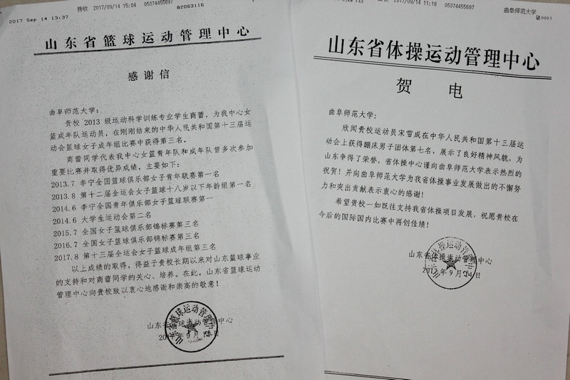 山东省篮球运动管理中心、山东省体操运动管理中心等发来贺电,祝贺我校学子在全运会多个项目上取得的骄人成绩,感谢完美体育(中国)官方网站对山东省体育事业发展做出的贡献,并祝愿我校在今后的国际国内比赛中再创佳绩。