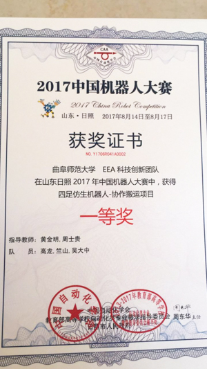 8月17日,由中国自动化协会、日照市人民政府主办的2017中国机器人大赛在山东日照落下帷幕。在指导老师黄金明、周士贵的带领下,我校工学院竺山、顾潘龙、高龙等同学组成的三支参赛队伍,凭借过硬的专业能力和出色的现场发挥取得优异成绩,在四足仿生机器人——铁人三项项目中斩获国家一等奖1项、二等奖1项,在四足仿生机器人——协作搬运项目中获得国家一等奖1项。