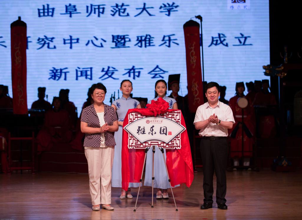 曲阜市人大常委会李玲主任、学校党委书记戚万学共同为雅乐团揭牌