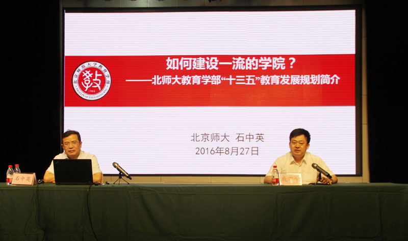 27日上午,石中英教授为学习班做了题为《如何建设一流的学院》的辅导报告。校长戚万学主持了报告会。石中英结合自身学术研究情况,以北京师范大学教育学部“十三五”教育发展规划为例,就“如何建设一流的学院”从规划背景、建设目标、建设任务、组织保障四个方面做了深入分析和讲解。他从国家出台的政策方案、高等教育的世界发展趋势、兄弟院校的特色发展战略以及学科的交叉发展等方面介绍了北师大教育学部“十三五”教育发展规划的背景,并强调,规划工作要坚持方向性、整体性、民主性、科学性、特色性等原则。随后,石中英介绍了规划建设的思路与总体目标,并以2015年教育组织学科排名为根据,分析了北师大的教育学科竞争力。他辅以招生质量、论文发表数量、国际合作情况等表格,具体介绍了规划建设的任务:以“一体化”为理念,全面统筹教育学科发展;以APLIC为核心素质,完善教育人才培养体系;以“四个影响力”为标准,提升科学研究的质量;以人事制度改革为抓手,打造卓越教师队伍;以深化国际合作为路径,全面提升国际影响力等。整场报告内涵丰富、分析透彻,令人深受启发。