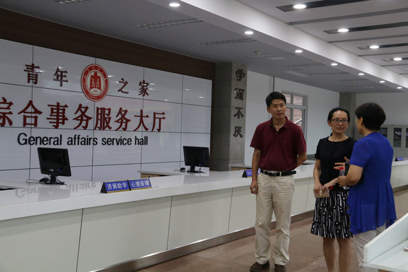 康淑敏代表学校对团中央调研团一行表示欢迎,简要介绍了我校的办学历程、办学成就、学科特色及团学工作等基本情况。康淑敏指出,团中央领导此次专程到我校调研,是对我们学校共青团工作的肯定和鞭策,希望团中央、团省委领导对我校的团学工作给予宝贵指导、提出宝贵意见。团委书记屈跃宽汇报了我校共青团特色工作,团委副书记、日照校区学生工作办公室副主任陈庆国汇报了我校“青年之家——GCP综合服务平台”的建设工作。