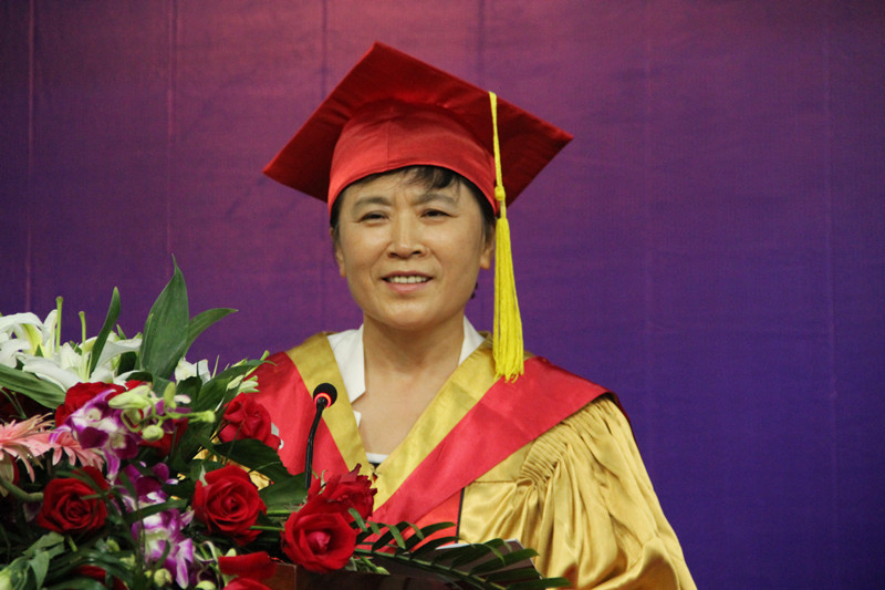 在校歌《犁牛之子歌》的旋律中,校长戚万学为博士、硕士学位获得者拨苏正冠、颁发学位证书,并与他们合影留念。