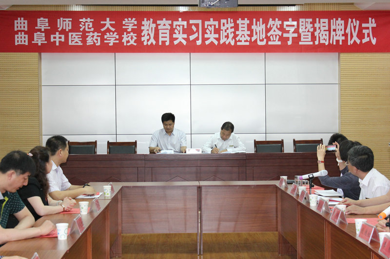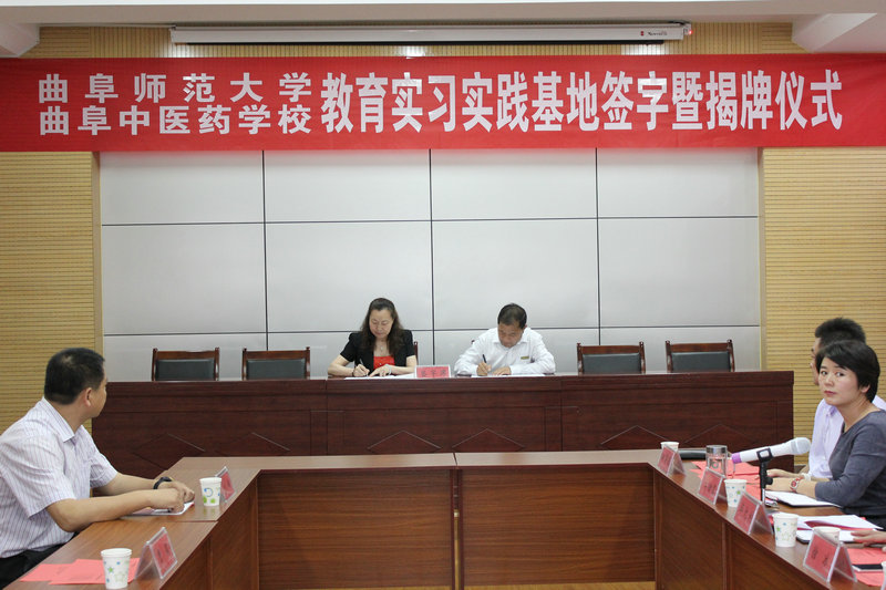 体育科学学院院长曹莉与曲阜中医药学校校长孔令俭签署了教育实习基地协议,研究生工作部副部长刘敏和孔令俭签署了研究生教育实践基地协议,我校副校长扈庆学与曲阜市人大副主任段德柱共同为基地揭牌。