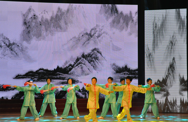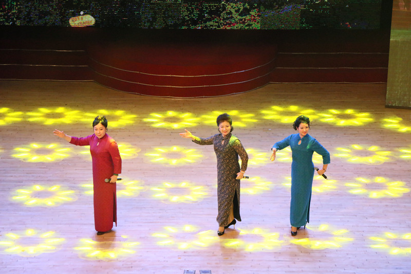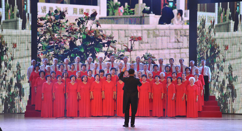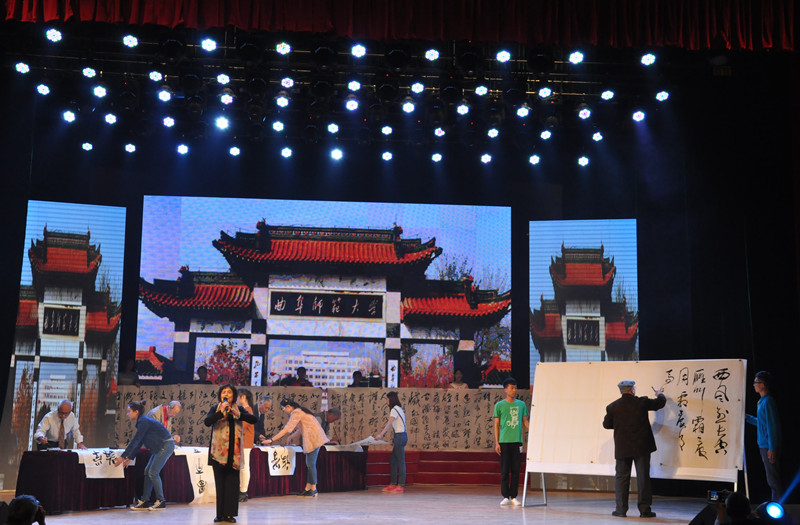 在恢宏的音乐声中,老年合唱团率先登台,合唱校歌《犁牛之子歌》和《中国之梦》,使观众精神为之一振;由退休教师董文华和文学院在职教师李钧带来的配乐诗朗诵《创业颂》完美地再现了一代又一代教师筑梦育人的奋斗史;京剧联唱《没有共产党就没有新中国》表现了曲园人对党和祖国的诚挚爱意;在舞台两侧投射出的水墨画的映衬下,由老年太极队表演的太极拳《太极生辉庆华诞》引领观众走入诗情画意的世界;男生二重唱《游击队歌》、《阿拉木汗》将现场气氛推向高潮;青松不老、风鹤长鸣,时装表演《多彩曲园》将老教师们积极向上,与时俱进的年轻心态诠释到了极致;书法和京剧都是中华民族的高端艺术、传统文化的国粹精华,书画京剧《西风烈》使得二者能够联袂同台呈现,京剧唱腔更加声情并茂,书法艺术更加气韵生动;广场舞《洗衣欢歌》、《中国喜事》两种不同风格的舞曲串烧,使现场充满喜庆气氛;老年舞蹈队在交谊舞《友谊地久天长》的欢快节奏中变换着脚步,博得观众的一阵阵掌声;演出在歌曲《共筑中国梦》中落下帷幕,大气浑厚的旋律、真挚激扬的情感唱出了曲园人共筑曲园梦,杏坛飞彩虹;共筑中国梦,昂首再启程的的决心和壮志。