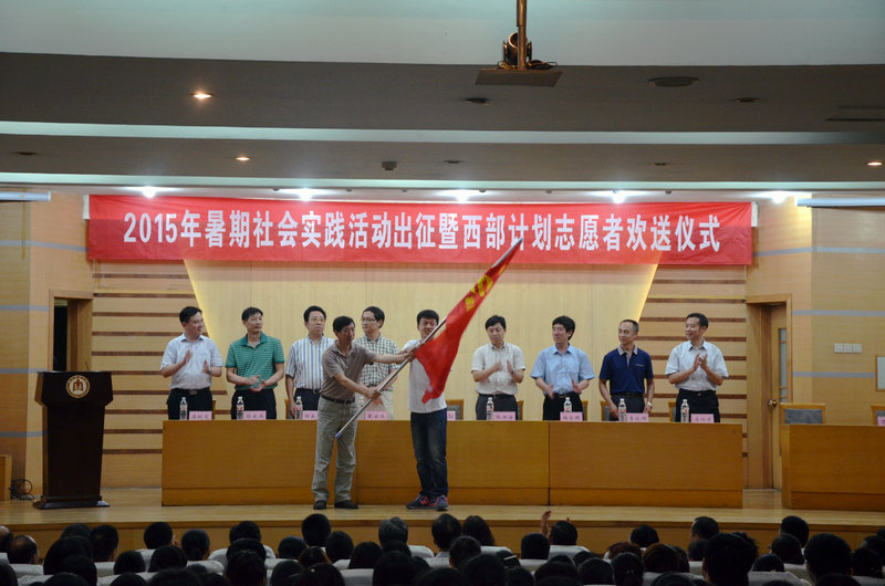 7月6日,我校举行2015年暑期文化科技卫生“三下乡”社会实践活动启动仪式,欢送大学生志愿服务西部计划志愿者和研究生支教团。党委书记荆兆勋、副校长康淑敏、副校长张洪海出席活动。学校办公室、学生工作处、教务处、研究生处、招生就业处、保卫处、校区学生工作办公室等相关单位负责人,各学院党总支副书记、团总支书记,各实践服务团的指导教师和青年志愿者代表参加仪式。