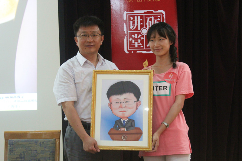 副校长扈庆学为郭建华颁赠了杰出校友纪念牌及尼山石纪念章,并赠予其母校就读期间的学籍档案复印件。郭建华留下了自己的手模,并题词和录制微视频为母校校庆送上了祝福。郭建华还收到了校庆志愿者同学为其精心手绘的肖像画。数学科学学院院长孟凡伟主持讲堂。