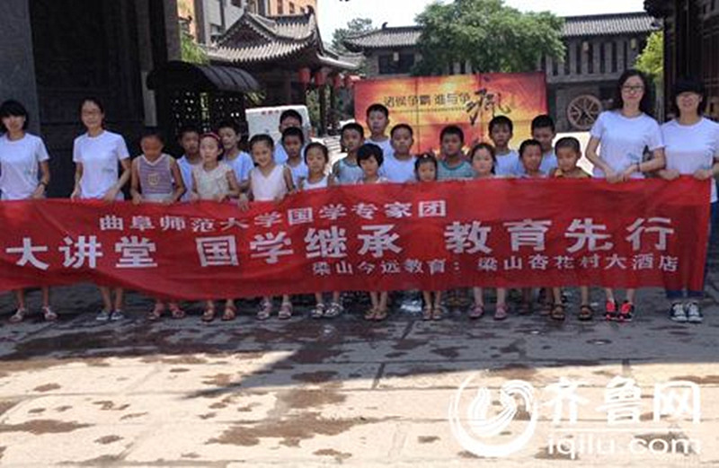 “弘扬传统文化、普及国学知识、净化浮华世风”。在当下“娱乐至死”、“快餐文化”等大行其道的今天,总有那么一群年轻人认为国学教育是传承中华文明、弘扬民族精神和培养爱国情怀的重要途径,可以抵制流行文化元素对儿童教育发展带来了一系列弊端与不良影响。他们希望通过对国学经典的学习和实践,使孩子们在优秀传统文化熏陶中涵养品格,树立正确的世界观、人生观、价值观。 7月14日,由我校文学院“国学继承·教育先行”调研团队主办的国学大讲堂在水浒故里——济宁梁山举行。梁山多所学校的学生及家长参加了此次学习交流。队员们生动阐述了国学的内涵,细致讲解了中华优秀文化与社会主义核心价值观一脉相承关系,阐释了诗歌、传统节日、生肖属相等文化遗产的由来和意义。他们用风趣幽默、生动活泼的语言配以游戏、影像资料、课件等丰富多彩的讲授形式引领听众们走进传统文化,感受传统意蕴。