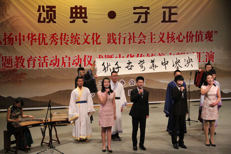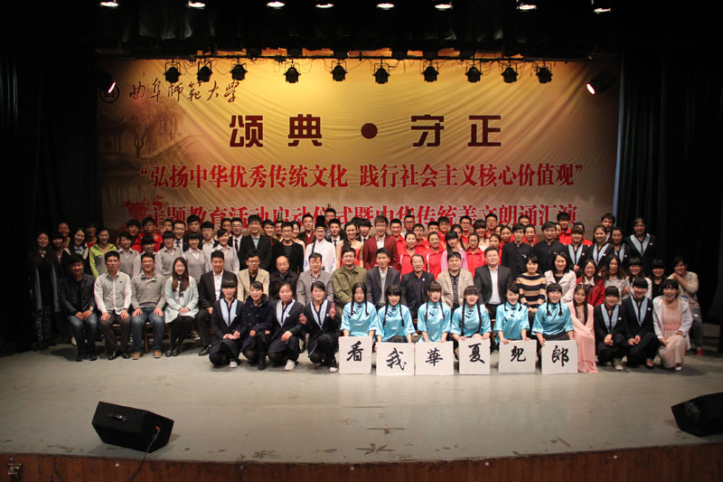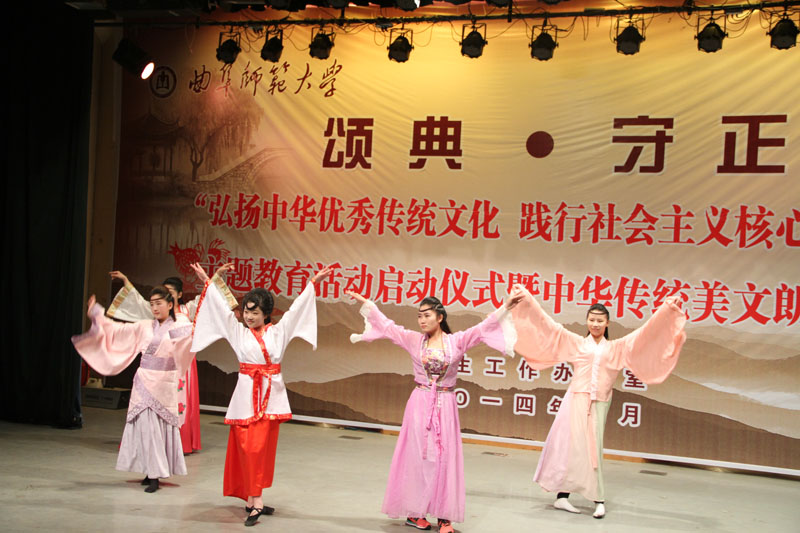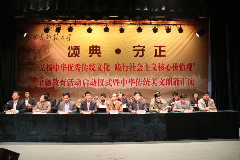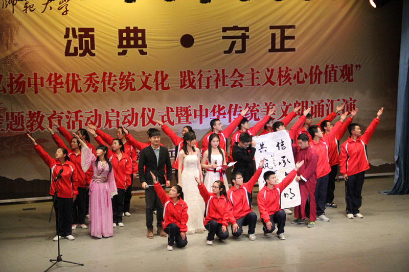 为弘扬中华优秀传统文化,践行社会主义核心价值观,根据教育部《完善中华优秀传统文化教育指导纲要》和学校《关于在学生中开展培育和践行社会主义核心价值观教育活动的通知》精神,结合日照校区实际,4月14日晚,由日照校区学生工作办公室主办的“颂典•守正—弘扬中华优秀传统文化、践行社会主义核心价值观”中华传统文化主题教育活动主题教育活动启动仪式暨中华传统美文朗诵汇演在音乐厅举行。