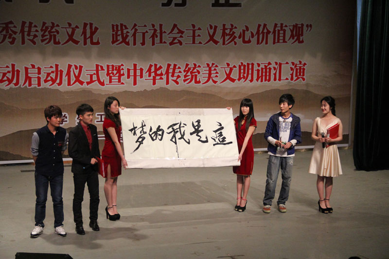 随后,中华传统美文朗诵汇演华丽开场。美术学院将诗朗诵与艺术完美结合,现场书法作品“这是我的梦”同时配以沙画,美轮美奂;翻译学院的《华夏赞歌》将个人朗诵与团体朗诵相结合,展华夏儿女之风采,树炎黄子孙之气概;政治与公共管理学院个人朗诵《将进酒》,表演者化身李太白,梦回大唐,如痴如醉;琴棋书画,古典风韵至今犹存,法学院将《悠悠中华颂》的传统美展现的淋漓尽致;薪火相传梦不熄,信息技术与传播学院的深情朗诵展示出中华儿女的铿锵之美;经济学院《儒韵未央,与梦同行》突显儒家经典,嘹亮动听的朗诵与全情的演绎让人震撼。电气信息与自动化学院激扬的朗诵配以独舞,传承文明、共筑梦想。在短短一个小时的时间里,音乐厅里不时响起一阵阵雷鸣般的掌声。期间穿插了舞蹈《礼仪之邦》以及武术表演《梅花三弄》,更是将现场推至高潮。