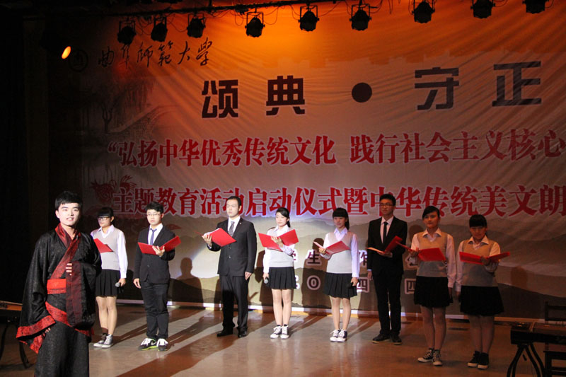 据悉,“颂典•守正—弘扬中华优秀传统文化、践行社会主义核心价值观”中华传统文化主题教育活动将贯穿2014年全年,包括“感受经典 静心读写”—中华国学经典诵读大赛、百句经典语录征集、国学讲堂、国学达人秀、曲园汉字争霸赛、沐浴国风之我爱记诗词、国学知识推广网站制作大赛、超级演说家—传统文化篇等13项具体活动。