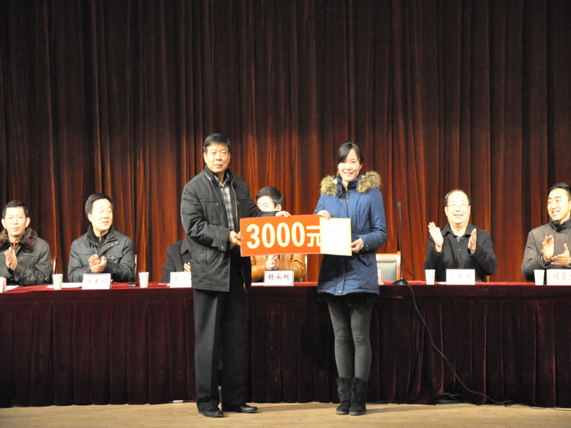 在欢乐的乐曲声中,获奖同学代表依次走到主席台前,从颁奖嘉宾手中接过学院奖励的奖金牌匾和获奖证书。