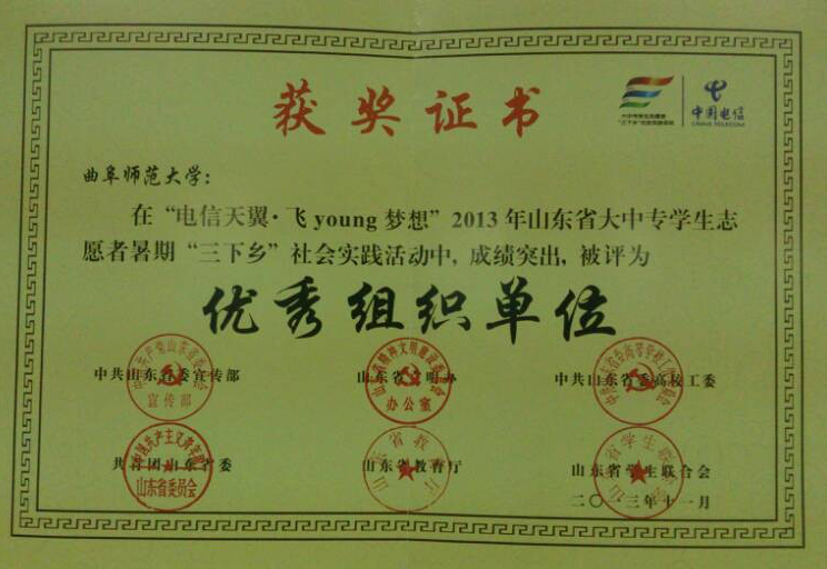 在近日结束的2013年暑期文化、科技、卫生“三下乡”山东省大中专学生志愿者社会实践活动省级评选中。我校团委荣获“优秀组织单位”称号。黄江滔、王琼、孙俊华、赵旭涛等18位教师荣获“社会实践优秀指导者”称号;步立鹏、杨昆、张文涛、李贤贤等38名学生获“优秀学生”称号;“暖风行动·让爱回家”关爱留守儿童暑期志愿者团队、儒家文化齐鲁行服务队、珍爱西行支教团等15支团队获得“优秀服务队”称号。