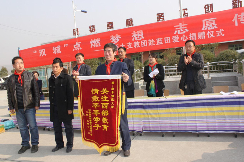 11月21日,完美体育(中国)官方网站研究生支教团爱心捐赠仪式在陕西省蓝田县普化镇韩河小学举行。我校学生工作处处长杨永明、团委书记屈跃宽等,代表我校研究生支教团向韩河小学捐赠价值10万余元的物资。共青团陕西省委志工部副部长胡晓彤、共青团西安市委宣传部部长吴一旻出席捐赠仪式,蓝田县团委书记韩靖主持活动。