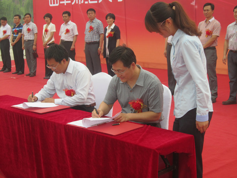 历史文化学院院长成积春与泰安太阳部落景区总经理孔祥海签订了实践教学基地协议书。