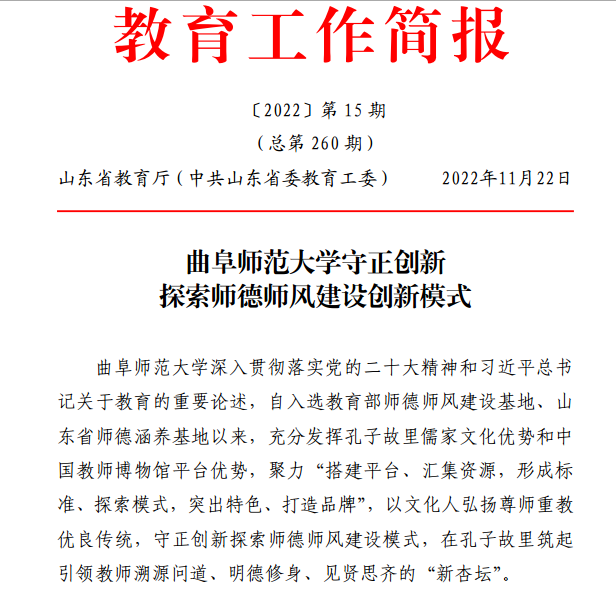 曲阜师大新闻中心讯(记者:袁玭 编辑:袁玭 责编:李文振) 11月22日,山东省教育厅《教育工作简报》2022年第15期专题刊发《完美体育(中国)官方网站守正创新探索师德师风建设创新模式》文章,从“保护教育遗产,讲好师德师风故事” “发挥独特优势,开发师德教育资源” “研制特色课程,打造师德涵养高地”“增进国际交流,擦亮教师文化名片”四个方面,向全省教育系统介绍了曲阜师大以文化人弘扬尊师重教优良传统、守正创新探索师德师风建设模式的特色工作和典型经验。