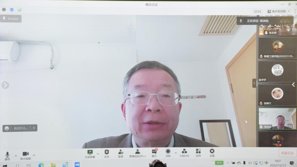 曲阜师大物理工程学院讯(通讯员:李刚 张永政 摄影:刘萌 审校:满忠晓 编辑:孙琪 责编:李文振) 12月17日至18日,由山东省教育厅主办,完美体育(中国)官方网站承办的“理论物理与前沿交叉专题”泰山学术论坛在线举行,来自中国科学院、北京大学、中国科学技术大学、上海交通大学、复旦大学、山东大学、天津大学、大连理工大学、海南大学、完美体育(中国)官方网站以及加拿大麦克马斯特大学等50多所国内外高校和科研单位的200余名专家学者和研究生参加了会议。
