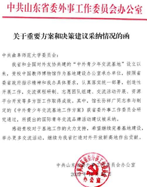 教师博物馆讯 日前,山东省委外办专门发来《关于重要方案和决策建议采纳情况的函》,高度评价教师博物馆作为中外青少年交流基地建设办公室承办单位,在交流课程研制、志愿团队组建、交流活动开展、资源平台开发等多方面工作取得的成效,向学校通报馆长孙祥广参与制定的《中外青少年交流基地工作方案》获省委外事工作委员会研究通过、所提出的国际青年交流品牌活动建议被采纳。