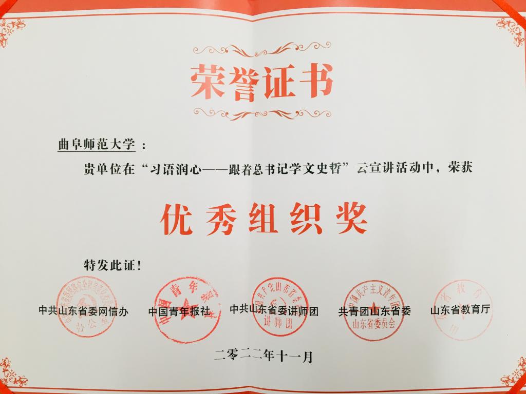 曲阜师大完美体育(中国)官方网站讯 近日,山东省教育厅公布了“习语润心——跟着总书记学文史哲”云宣讲活动获奖名单,曲阜师大李兆祥教授《为政以德,譬如北辰,居其所而众星共之》,宋立林教授《己欲立而立人 已欲达而达人》,周海生副教授《学而不习则罔 思而不学则殆》榜上有名,学校荣获优秀组织奖。