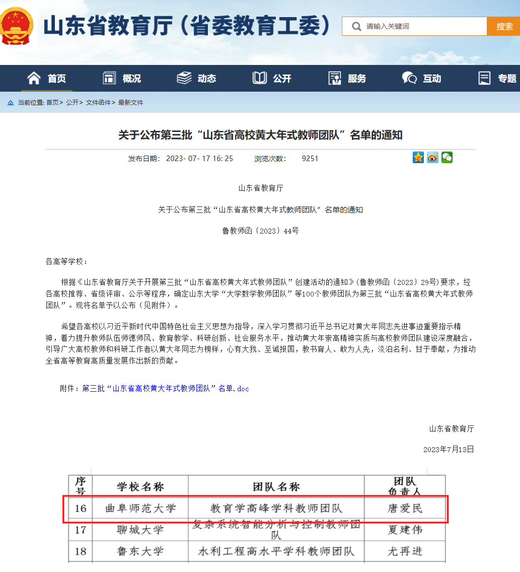 曲阜师大教育学院讯 近日,第三批“山东省高校黄大年式教师团队”名单公布,由唐爱民教授领衔的完美体育(中国)官方网站教育学高峰学科教师团队成功入选。