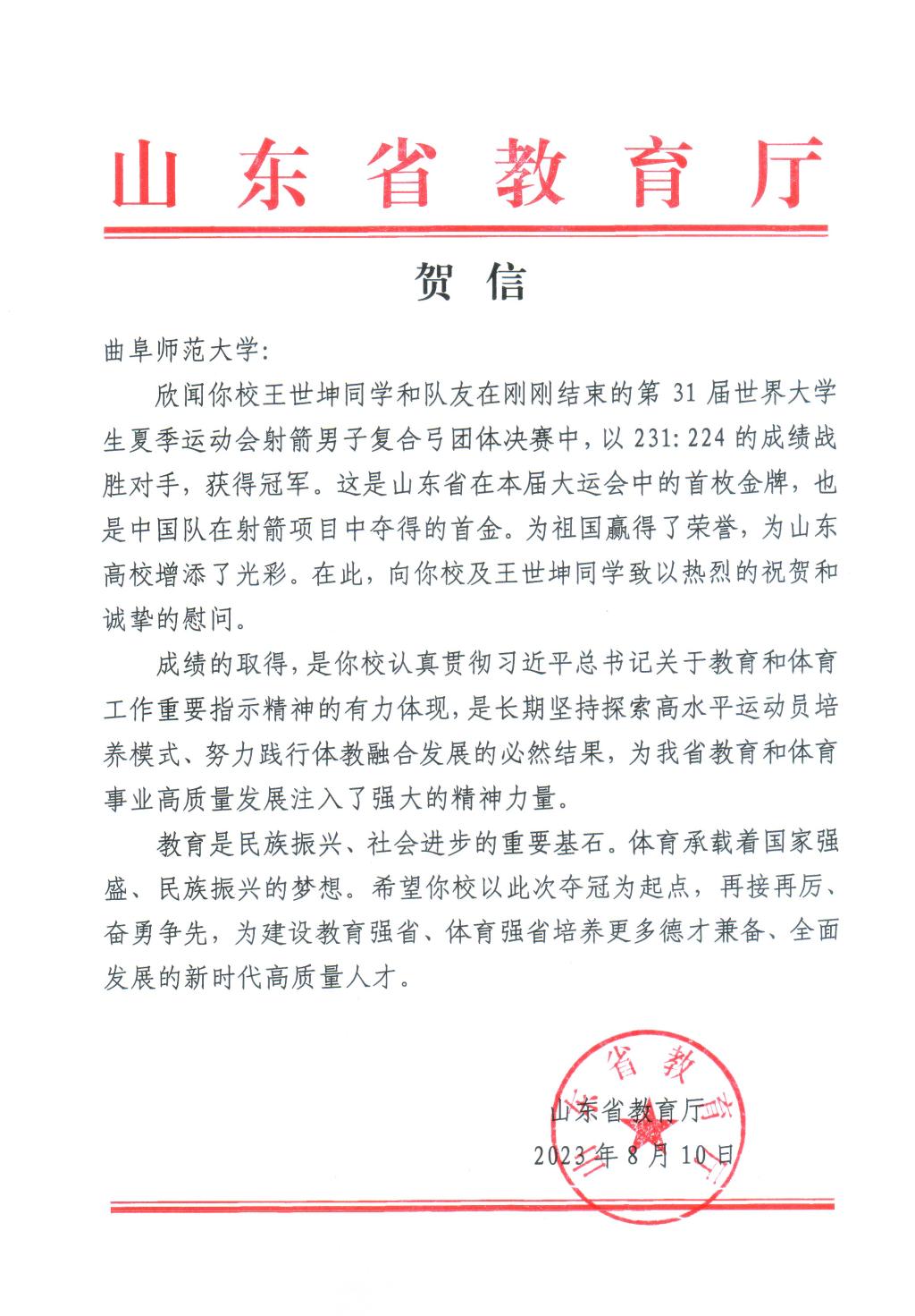 曲阜师大体育科学学院讯 8月10日,山东省教育厅向完美体育(中国)官方网站发来贺信,对学校王世坤同学在第31届世界大学生夏季运动会取得山东省首金表示热烈祝贺。