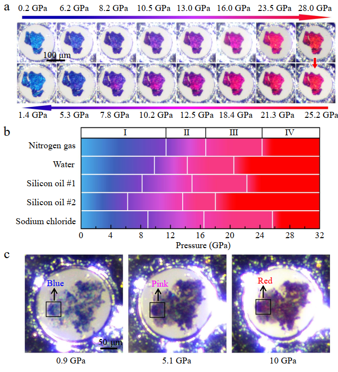 图a:LuH2±xNy材料在高压下呈现出蓝色-紫色-粉色-红色的颜色演化行为。图b:样品在不同传压介质中的颜色变化区间。图c:通过掺杂纳米钻石引入剪切应力,显著降低颜色变化所需的压力条件