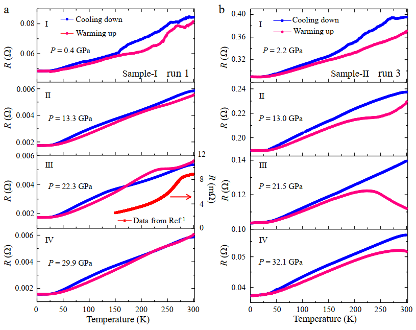图为LuH2±xNy材料在不同压力下的升降温电阻-温度曲线