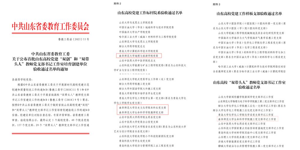 曲阜师大党委组织部讯 日前,省委教育工委公布全省第三批新时代高校党建工作示范高校、标杆院系、样板支部培育创建单位名单和首批山东高校党建“双创”和“双带头人”教师党支部书记工作室培育创建单位验收通过名单。曲阜师大3个基层党组织入选全省第三批高校党建“双创”培育创建单位,马克思主义学院党委入选标杆院系培育创建单位,政治与公共管理学院教工党支部、历史文化学院中国史教工党支部入选样板支部培育创建单位。入选首批山东高校党建“双创”和“双带头人”教师党支部书记工作室的4个基层党组织全部顺利通过验收,地理与旅游学院党委、历史文化学院本科生党支部和生命科学学院教师党支部分别通过标杆院系和样板支部培育创建单位验收,生命科学学院教工党支部书记工作室通过“双带头人”教师党支部书记工作室验收。