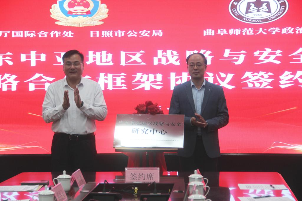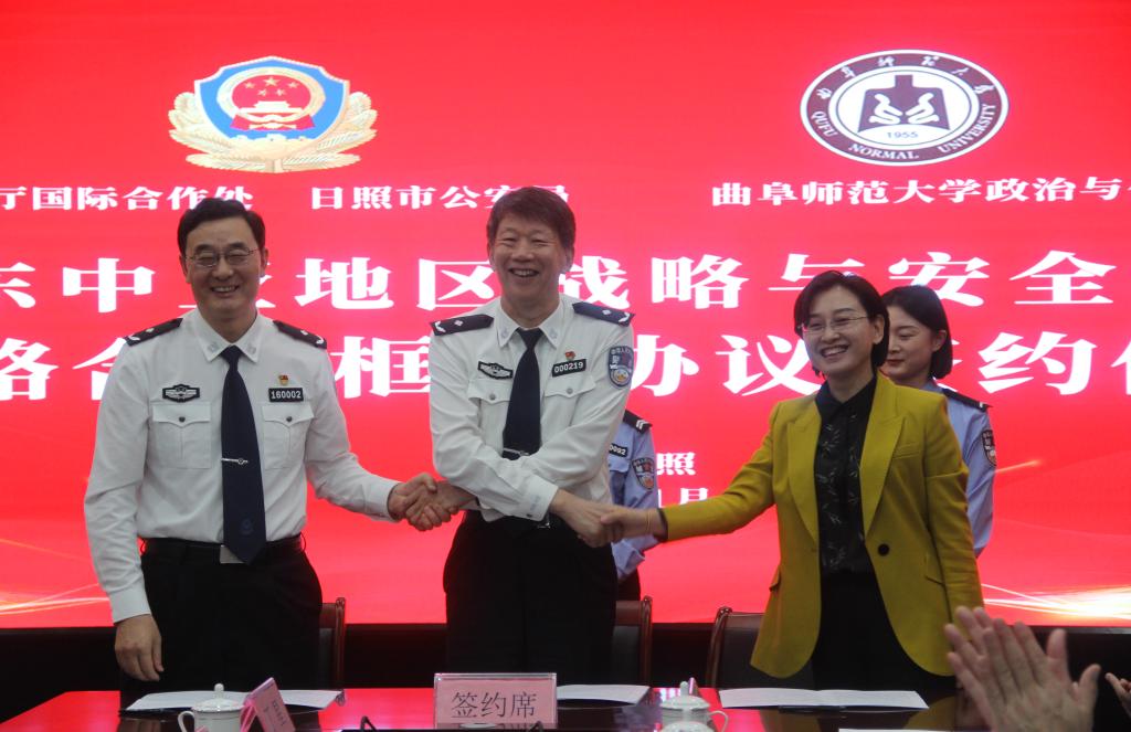 政治与公共管理学院讯 为进一步推进国际执法合作,充分发挥高校科研优势,全面展示属地公安机关安全保卫职能,推进中东中亚地区战略与安全研究,11月3日上午,山东省公安厅国际合作处、日照市公安局和曲阜师大政治与公共管理学院举行合作协议签约暨中东中亚地区战略与安全研究中心揭牌仪式。省公安厅国际合作处处长侯献合,曲阜师大党委常委、副校长陈刚,省公安厅国际合作处副处长、三级调研员崔培飞,日照市公安局党委副书记、政委王兴展出席仪式。签约仪式由市公安局党委委员、副局长刘军主持。