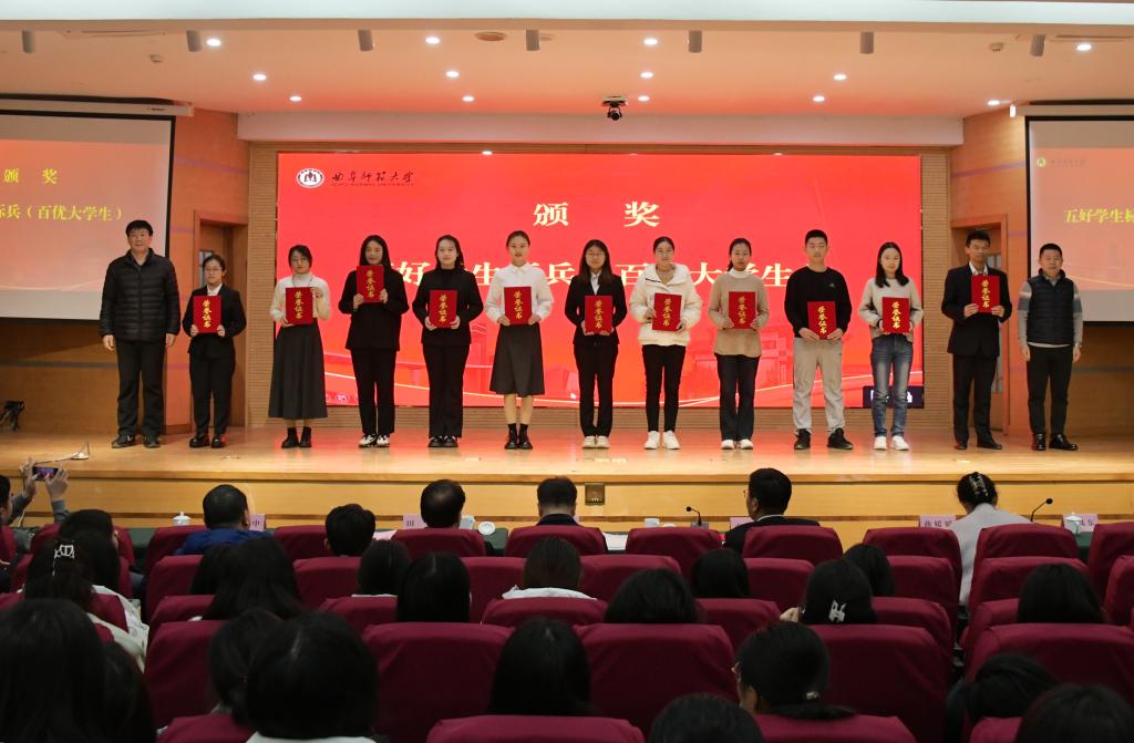 第二阶段举行了颁奖典礼。张洪海与曲阜校区获得校长奖学金的学生合影;卢国强和姜美颖分别在两校区为10名校长奖学金获得者颁发了奖杯和“十佳大学生”证书;各学院党委副书记为两校区共100名学生颁发了“百优大学生”证书。