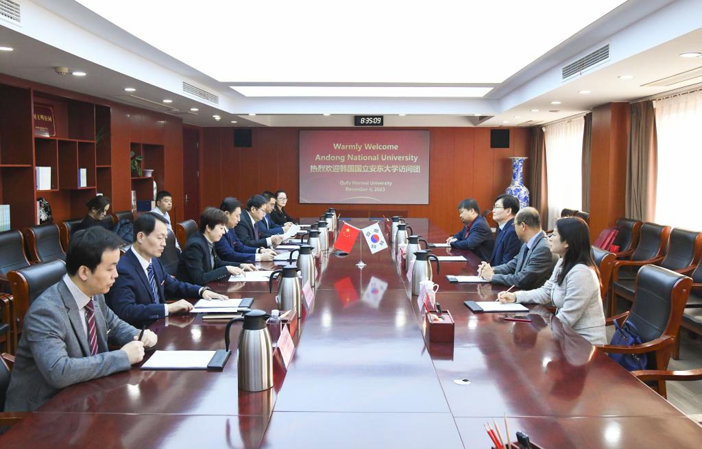 曲阜师大国际交流合作处讯 12月4日至6日,韩国国立安东大学校长郑泰柱、计划处处长李爀载、招生处处长兼孔子学院韩方院长金炳圭一行三人来校交流访问,孔子学院中方院长王秀卿陪同。校长张洪海会见来宾并举行座谈,国际交流合作处、人事处、文学院、国际教育学院等相关单位负责人参加座谈。