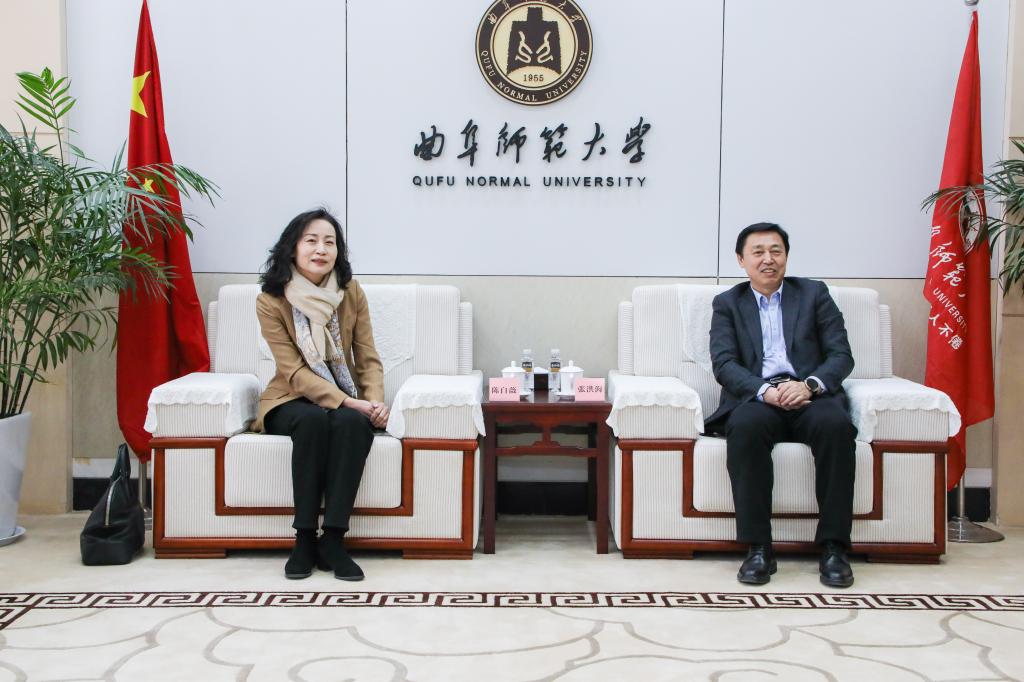 曲阜师大完美体育(中国)官方网站讯 2月29日上午,山东省委外办副主任、省对外友协常务副会长陈白薇到曲阜师大调研指导中外青少年交流基地工作。曲阜师大党委副书记、校长张洪海会见陈白薇一行。山东省对外友协秘书处处长周卫,曲阜师大党委副书记李志红,党委常委、宣传部部长孙祥广,济宁市委外办党组书记、主任王昌贯一同参加座谈调研。
