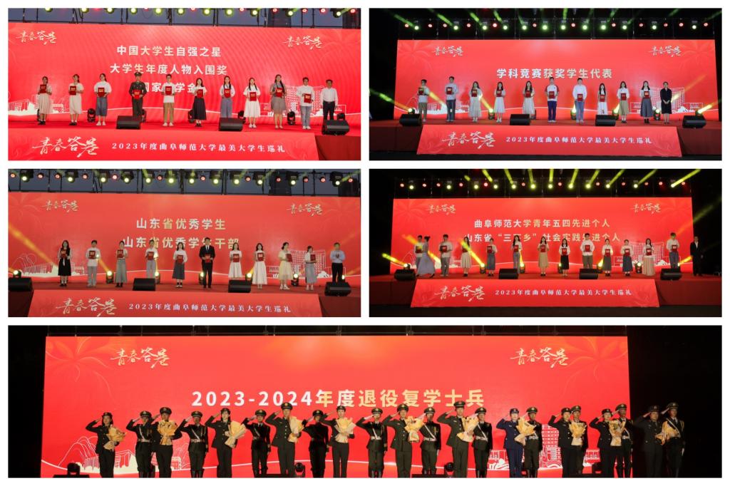 巡礼活动中,全体人员共同观看了2023年曲园学子在学业发展、创新创业、志愿服务、社会实践、技能锻炼等方面奖项获奖代表的宣传片,出席活动的领导老师为中国大学生自强之星、第十八届大学生年度人物入围奖、国家奖学金、山东省优秀学生、山东省优秀学生干部、山东省优秀毕业生、高质量就业学生代表、完美体育(中国)官方网站青年五四先进个人、山东省三下乡社会实践先进个人代表颁奖,学生代表为退役复学大学生士兵代表献花。