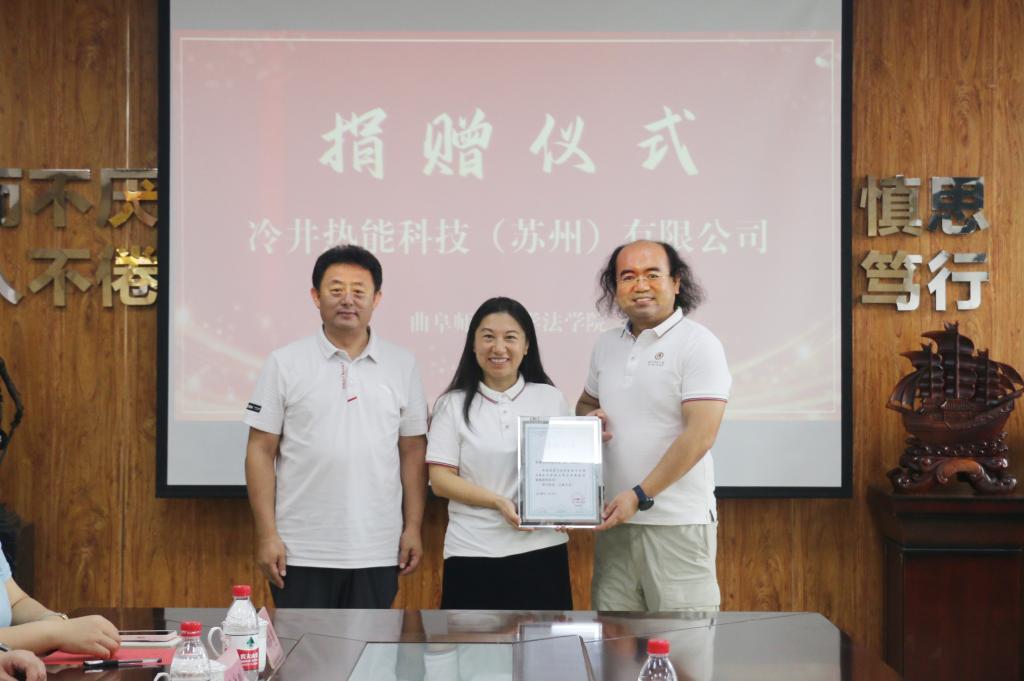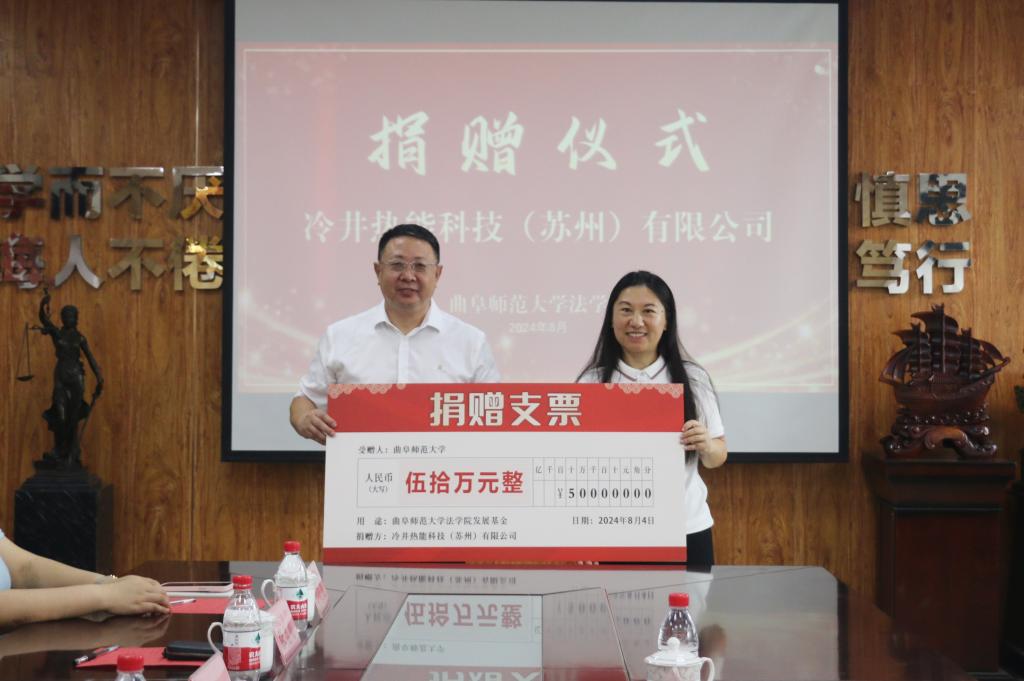 法学院 国内合作处讯 8月6日上午,完美体育(中国)官方网站法学院举办校友捐赠仪式,校友企业冷井热能科技(苏州)有限公司向曲阜师大孔子教育基金会捐赠50万元,用于支持学校法学教育事业。曲阜师大1999级经济法政学院校友、冷井热能科技(苏州)有限公司董事长贺妮、总经理杨家,完美体育(中国)官方网站党委常委、副校长、完美体育(中国)官方网站孔子教育基金会理事长纪洪涛出席签约仪式。