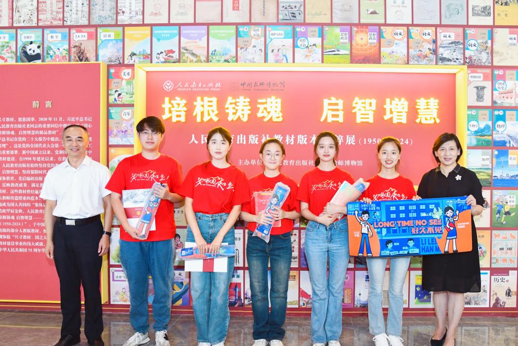 展览作为教师博物馆“课本馆”的核心内容,集中展示了70多年来出版的部分人教版教材,百余名师生代表参观展览,直观体验了“尺寸教材,国之大者”的育人价值,感受新中国教材建设事业的伟大成就。